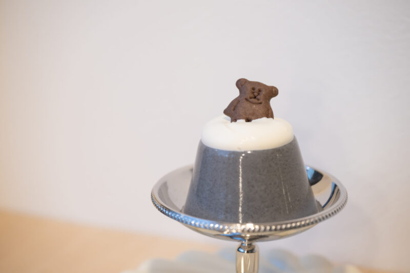 香ばしい黒ゴマの風味が広がるプリンに、ホイップクリームとかわいいクッキーをトッピングしました。