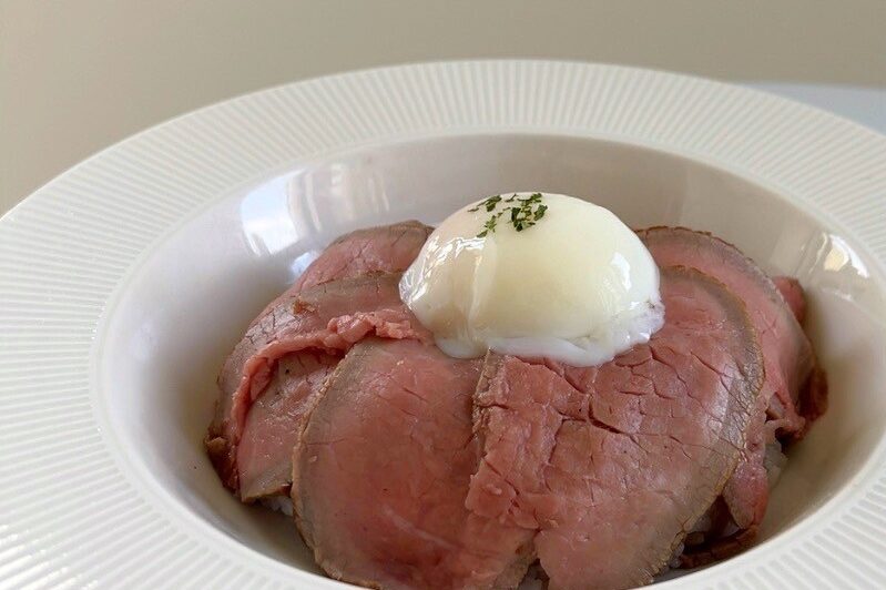 週末限定メニューです。ご飯の上にやわらかく仕上げたローストビーフをたっぷり乗せたヘルシーでご褒美感を満たす丼です。