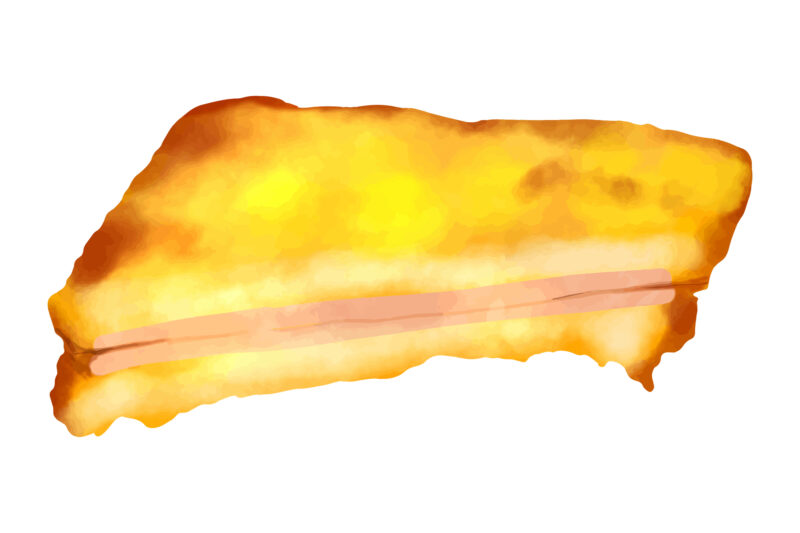 ハムとチーズを挟み、ベシャメルソースを塗ったパンをカリカリに焼き上げたサンドイッチです。