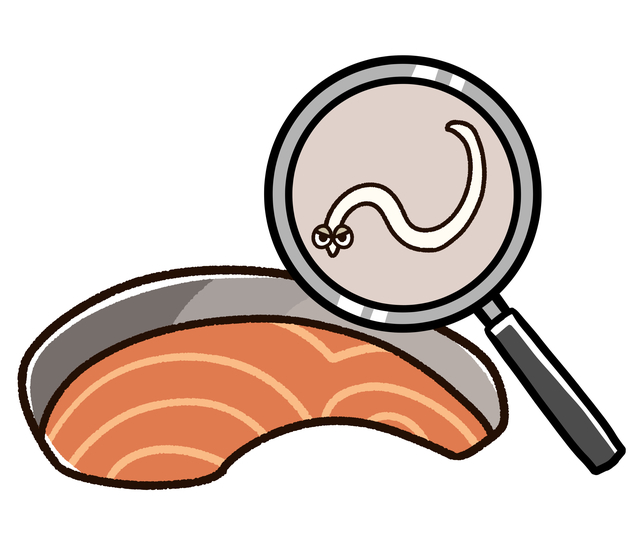 アニサキスは寄生虫の一種で、海洋生物の食物連鎖によって感染します。成虫はイルカなどの海洋哺乳類に寄生し、その糞便にまじった卵をオキアミなどのプランクトンが食べ、それを食べたサバ、サケ、イワシなどの魚介類が食べ、そこから人に感染します。